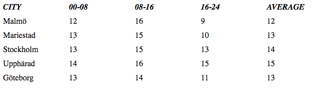 ["City", "00-08", "08-16", "16-24", "Average"],